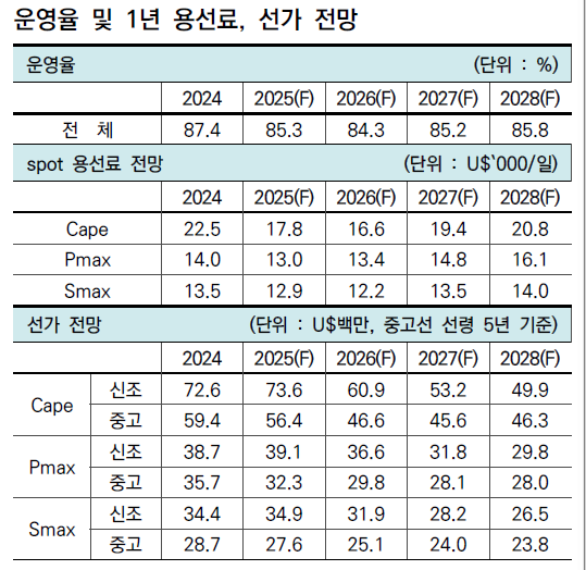 중고선가는 건화물선 운임시장 약세로 인한 수익성 악화 전망에 따라 하방 압력에 직면할 것으로 예상된다. `25년 조선소의 수주잔량 대비 작업기간(forward cover)은 3.5년으로 이후 건조 잔량이 점차 해소되면 건조 슬롯 확보가 용이해져 신조선 가격이 하향 안정되고, 이에 따라 중고선 가격도 추가 하락할 전망이다.