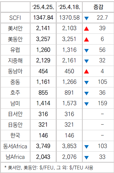 컨테이너 정기선 시황을 보면 SCFI는 2주 연속 하락했다.공급 조절 영향으로 북미는 상승하고 유럽은 하락했다. 운임방어를 위한 선사공급 조절이 계속되며 북미운임은 소폭 반등, 반면 유럽은 하락했다.