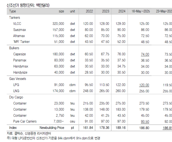컨테이너 정기선 운임에 불이 붙었다. 지난 주 신조선가지수와 중고선가지수 모두 상승했다. 신영증권 엄경아 애널리스트에 따르면 올해 21주차(5월 23일) 신조선가지수는 전주대비 0.01포인트 상승한 186.81p를 기록했다. 선종별 상세선가를 보면 탱커는 변동이 없었다. 드라이벌크선 중 케이프사이즈급은 50만달러 하락했다. 가스선 중 9만1000(91k)cbm급 LPG선도 50만달러 내렸다. 6500CEU급 자동차운반선 신조선가는 150만달러 하락한 것으로 나타났다.