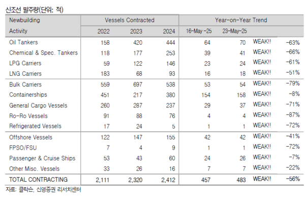 21주차 수주량은 오일탱커 6척, 케미컬 및 특수선 2척, LPG선 1척, LNG선 2척, 드라이벌크선 1척, 컨테이너선 4척, 제너럴카고선 8척, 여객선 및 크루즈 2척 등 총 26척을 기록했다. 누적 수주량은 483척이고 전년동기 누적 수주량은 총 688척이었다.