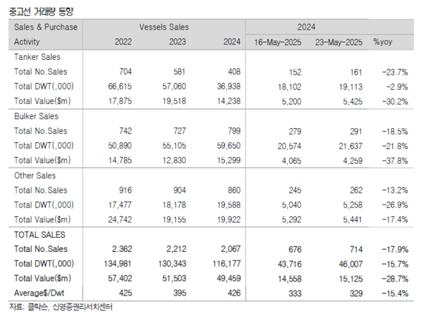 21주차 중고선박은 총 38척 거래됐다. 누적기준 거래량은 714척이며, 전년동기 누적 거래량은 870척이었다.