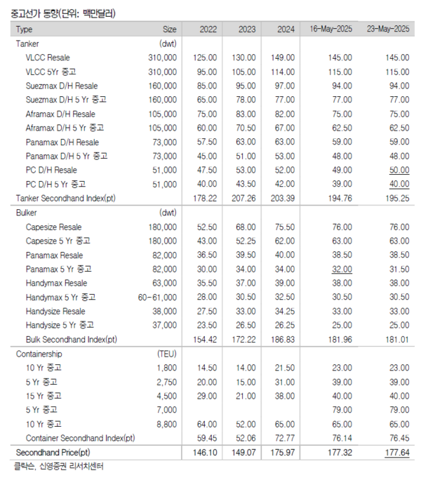 21주차 중고선가지수는 전주대비 0.32포인트 오른 177.64p를 기록했다. 선종별 상세선가를 보면 탱커 중 MR탱커 리세일가격과 5년 중고선가는 1백만달러 상승했다. 드라이벌크선 중 파나막스급 5년 중고선가는 50만달러 하락했다.