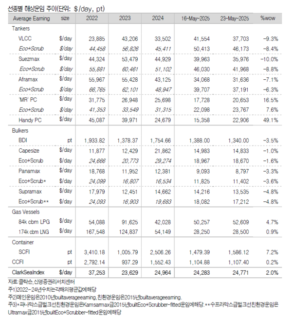 한편 지난 주(5월 23일) 탱커 운임의 경우 VLCC는 9.3% 하락해 3만7703달러를 기록했고 수에즈막스급 운임은 10.0% 내려 3만5976달러를 기록했다. 아프라막스급은 7.1% 하락한 3만1636달러를, MR탱커는 16.5% 상승한 2만653달러를 각각 기록했다. 핸디사이즈급 클린탱커 운임은 49.1% 급등한 2만2906달러를 기록한 것으로 나타났다.