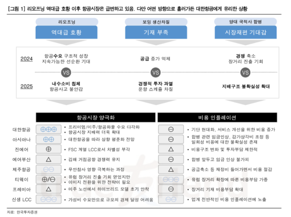 지난 2년간 호황기에선 운임이 상승하자 합병에 따른 독과점 폐해를 우려하는 목소리가 컸는데, 반대로 올해 양대 국적사가 국토부 제재로 장거리 항공권 가격을 낮추니 오히려 티웨이와 에어프레미아 등 경쟁사들이 영업에 더 큰 어려움을 겪고 있다. 또 아시아나 화물사업을 매각하자 수출입 시장에서 공급 공백이 우려되는 상황이다. 결국 대한항공의 시장 지배력에 대해 의심할 여지가 없다. 항공산업의 유기적 성장이 멈추고 LCC 등의 M&A 등 비유기적 성장도 어려워지자 대한항공 혼자 항공시장을 차지한 형국이다.