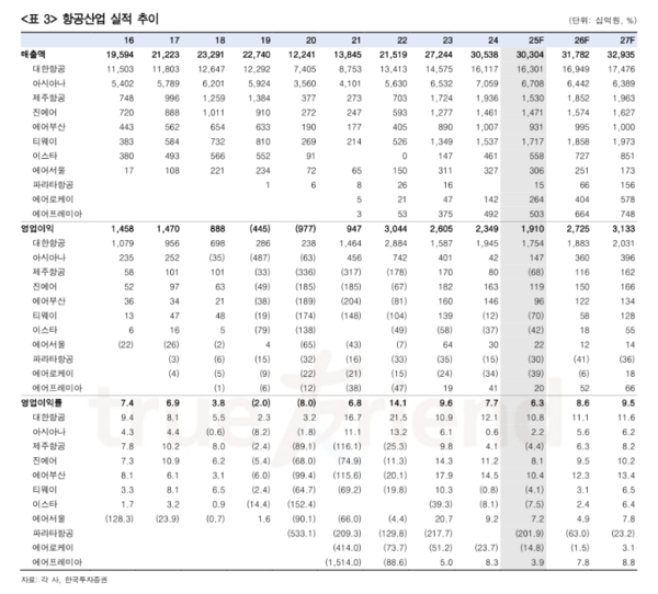이런 불안요인이 여객기 사고와 관세분쟁 등 대내외 변수들로 인해 1분기 실적쇼크로 폭발했다. 올해 항공산업영업이익은 전년대비 19% 감소할 전망이다. 고정비 부담은 높아지는데 수요 환경이 급변하고 있어 일부 항공사들은 통제력을 잃고 있다. 항공업종 투자 비중을 ‘중립’으로 내릴 필요가 있다는 것이다. 실적 눈높이를 낮추고 LCC 업계에 대해선 자본잠식 등 재무 리스크를 점검할 시점이다.