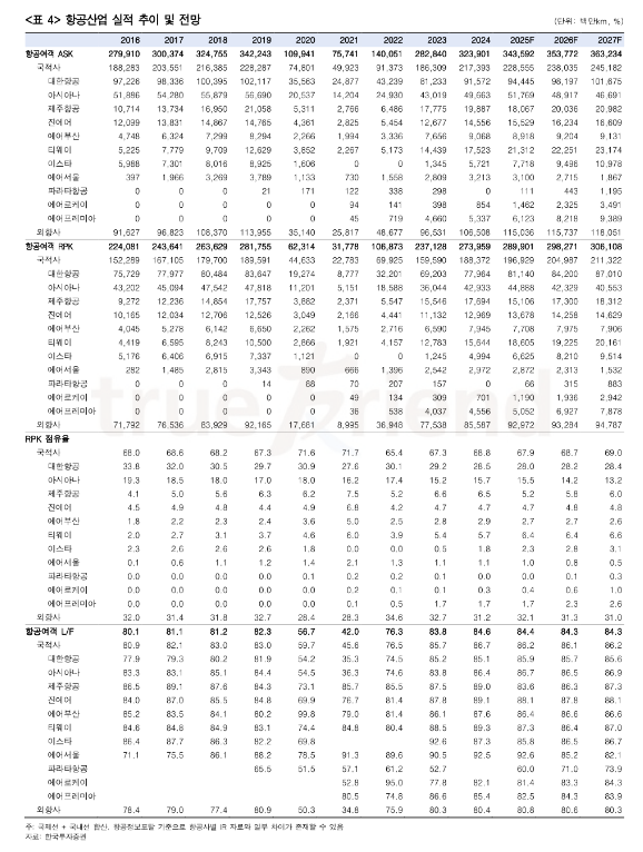 지리적 특성상 근거리 비즈니스 상용수요가 많지 않고 노선수도 제한적임에도 우리나라 항공시장의 위상은 갈수록 높아지고 있다. 김포-제주노선은 전세계에서 단일노선 기준 여객수 1위자리를 10년 넘게 지키고 있으며 인천국제공항은 국제선 여객과 화물 모두 글로벌 3위 공항으로 성장했다. 대한항공은 글로벌 16위권 항고사롤 발돋움했고 국제선 실적으로는 아시아 1~2위를 다투고 있다. 동북아시장에서 유일하게 LCC산업이 발전하며 소비자 선택의 폭을 넓히고 있다.