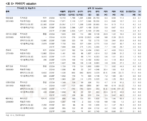 대신 진에어에 대해선 ‘매수’의견을 유지한다. 가만히 있어도 국내 LCC시장 점유율 40%를 확보하게 된다. 에어부산/에어서울 통합이 가장 중요한 과제였던 만큼 그동안 노선확장이나 투자를 자제해 왔던게 지금처럼 변동성 높은 시장 환경에선 장점이 된다. 반면 시장 재편에 있어 수동적인 모습으로 오해받아 M&A와 지배구조 변경 가능성이 부각됐던 다른 LCC 피어들에 비해 증시에서 소외받아 왔다. 올해 감익 영향을 반영해 목표주가를 15,000원으로 6% 하향조정하지만, LCC 1위 프리미엄을 감안할 때 밸류에이션 매력이 가장 높은 항공사다.