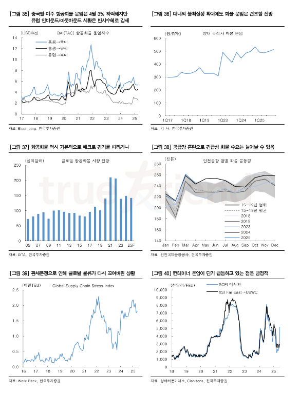 한편 항공화물 시황은 우려와 다르게 견고할 전망이다. 항공화물은 긴급하게 움직이는 특수성이 높은 시장이다. 기본적으로 가장 비싼 운송수단이기 때문에 관세인상에 따른 저항이 상대적으로 적다. 오히려 미국발 관세분쟁으로 글로벌 공급망이 혼란스러워지고 물류 스케줄과 이동 루트가 꼬이면서 급하게 운송하는 수요는 늘어날 전망이다.