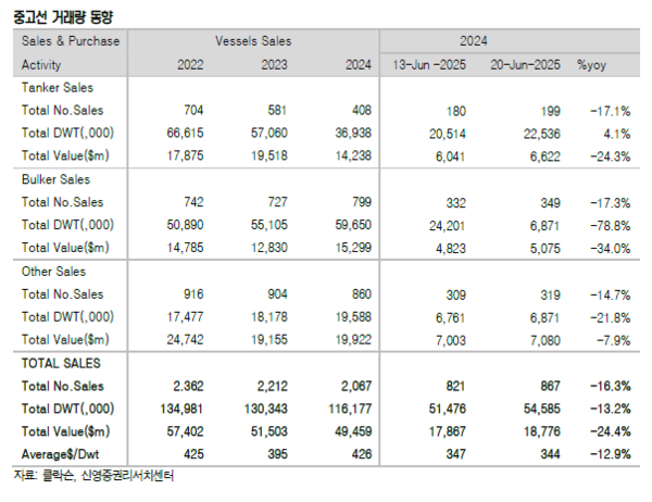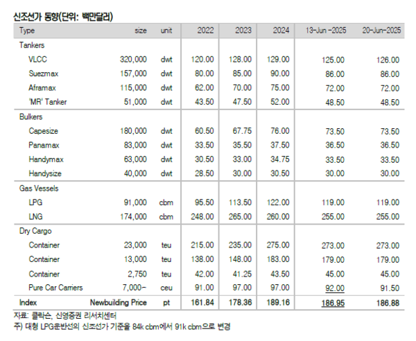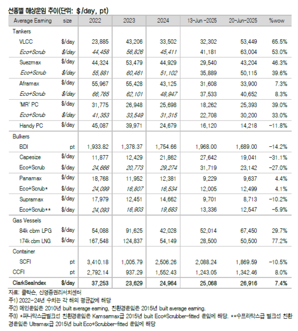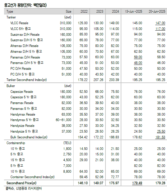 이스라엘-이란 갈등 격화로 탱커 운임 폭등했다. 지난 주 신조선가와 중고선가지수 모두 하락했다. 신영증권 엄경아 애널리스트에 따르면 25주차(6월 20일) 신조선가지수는 전주 대비 0. 07포인트 하락한 186.88p를 기록했다. 선종별 상세선가를 보면 탱커와 벌커는 변동이 없었다. 가스선과 컨테이너선도 변동이 없었으며 6,500CEU급 자동차운반선만 50만달러 하락했다.