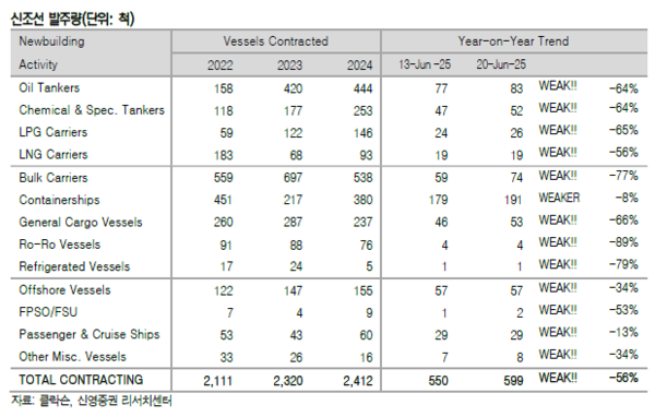 25주차 수주량은 오일탱커 6척, 케미칼 및 특수탱커 5척, LPG선 2척, 드라이벌크선 15척. 컨테이너선 12척, 제너럴카고선 7척, 부유식해양생산선 1척, 기타선박 1척 등 총 49척을 기록했다. 누적수주량은 599척이고, 전년동기 누적 수주량은 총 843척이었다.