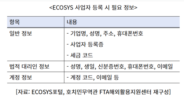 원산지증명서 발급 플랫폼을 이용하기 위해서는 먼저 사업자 등록이 필요하다. 등록은 ECOSYS 홈페이지에서 온라인으로 신청이 가능하며, 등록 시 입력해야 하는 주요 정보는 아래와 같다.