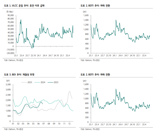 해운의 불확실성이 잦아드는 중이라는 분석이다. 30일 하나증권 안도현 애널리스트에 따르면 이란-이스라엘 휴전이 합의됨에 따라 이란의 호르무즈 해협 봉쇄도 현실화 가능성이 낮아졌다. 호르무즈 해협은 글로벌 해상 원유/LNG 수송량의 20%가 통과하는 구간이고, 사우디/카타르/이라크/UAE/이란 등 주요 산유국의 수출 항로로 사용되고 있다.