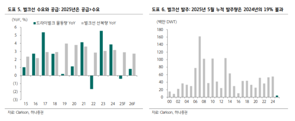 2025년은 공급(+3%)이 수요(-0%)를 초과하기 때문에 단기 운임 급등은 기대하기 어려우나, 신조 발주량이 급감하는 흐름이 지속되고 있다는 점에 주목한다. 2025년 5월 누적 벌크선 신조 발주량은 468만DWT로 2024년 동기 대비 19% 수준에 불과하다.