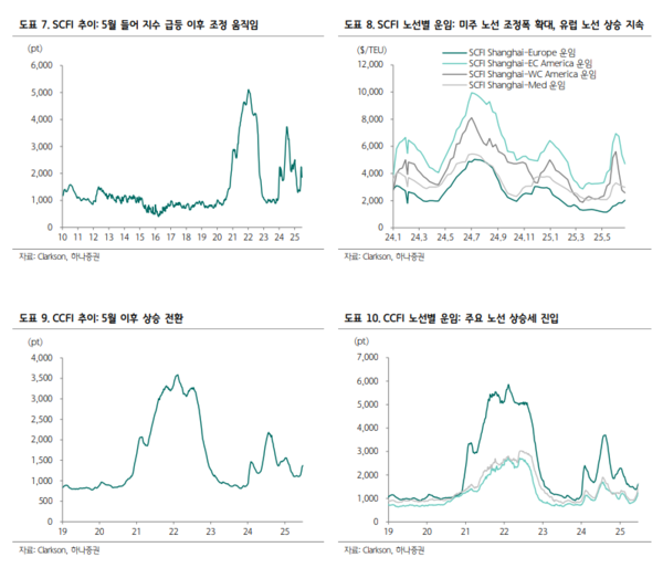 노선별 5월 초 대비 운임 상승폭은 미주 동안 44%, 미주 서안 43%, 유럽 69%에 이르는데, 미주 노선 공급을 회복하는 과정에서 유럽 노선 운임은 오히려 상승하는 모습이다. 참고로 현재 중국발 컨테이너선 평균 운임 지표인 CCFI(중국발컨운임지수)는 5월 초 대비 22% 상승한 1,369pt이다. 금번 운임 상승은 노선별 공급 조정에서 기인했기 때문에 상승폭은 제한적일 것으로 판단하고 있다고 안 애널리스트는 밝혔다.