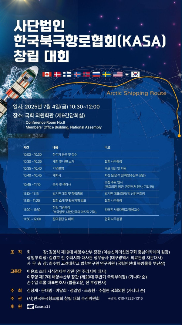 「사단법인 한국북극항로협회」(회장 김영석)가 7월 4일(금) 국회 의원회관 제9간담회실에서 공식 출범과 창립총회를 개최했다.