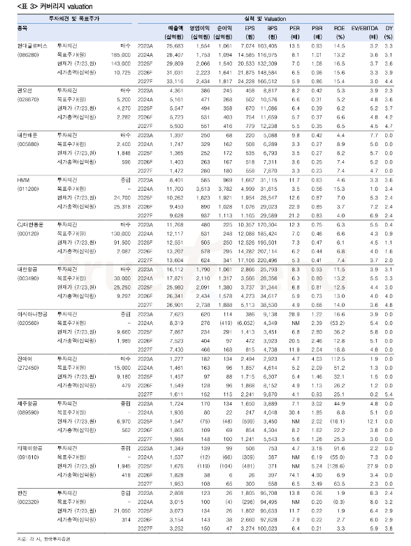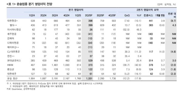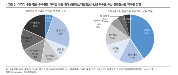 실제로 관세 분쟁과 내수소비 부진 등 부정적인 환경에서도 현대글로비스와 HMM만 영업이익 컨센서스가 우상향하고 있다. 대한항공은 한 차례 조정받았지만 적자가 우려되는 LCC와의 차이는 더욱 커졌다. 운송업종에서 시총 1~3위인 이들은 연간 2조원 수준의 영업이익이 기대되며 전체 커버리지의 60^ 이상 차지할 것으로 보인다.
