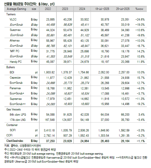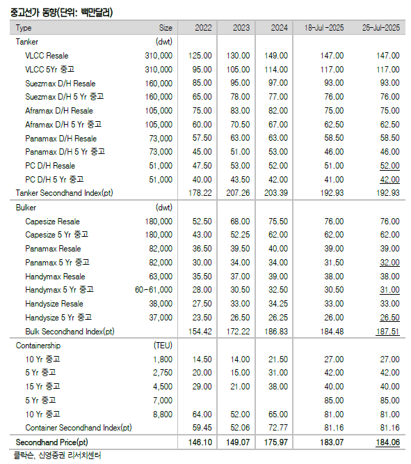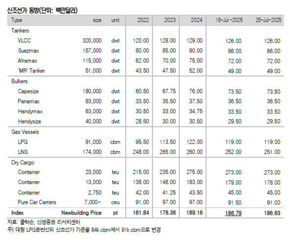 지난 주는 운임과 선가가 혼조세를 보였다. 신조선가지수와 중고선가지수 모두 상승했다. 신영증권 엄경아 애널리스트에 따르면 30주차(7월 25일) 신조선가지수는 전주대비 0.03포인트 상승한 186.66p를 기록했다.