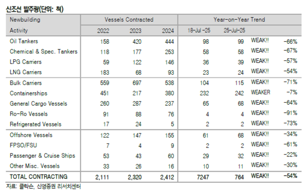 30주차 수주량은 오일탱커 1척, LPG선 3척, LNG선 1척, 드라이벌크선 11척, 컨테이너선 10척, 제너럴카고선 3척, 해양지원선 7척, 여객선 및 크루즈 3척, 기타선 1척 등 총 40척을 기록했다. 누적수주량은 764척이고, 전년동기 누적수주량은 총 1,223척이었다.