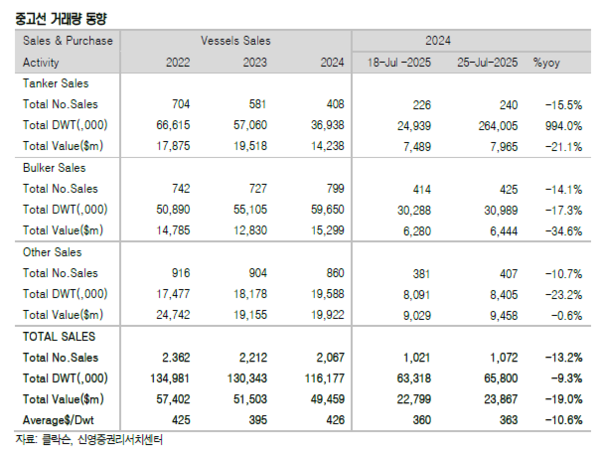 30주차 중고선박은 총 51척 거래됐다. 누적기준거래량은 1,072척이며, 전년동기 누적거래량은 1,235척이었다.