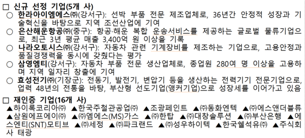 이번에 선정된 향토기업은 신규 5개 사, 재인증 16개 사 등 총 21개 사다. 시는 지난 4월 공모 접수한 기업을 대상으로 서류평가를 진행했으며, ‘기업애로해소대책위원회’ 심의를 거쳐 최종 21개 사를 확정했다.