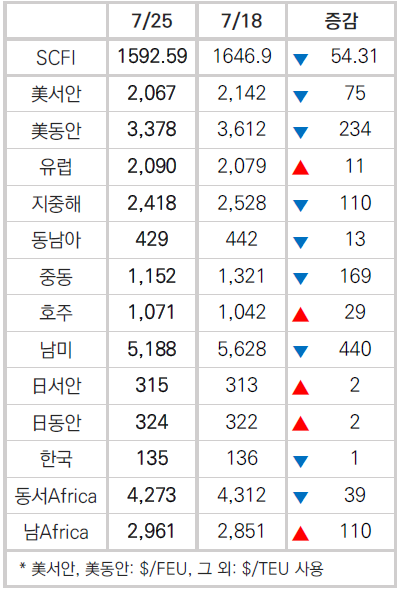 컨테이너 정기선 시황을 보면 SCFI가 7주 연속 하락했다. 관세 유예 만료전 관망세가 증가하며 북미항로 약세가 지속됐다.