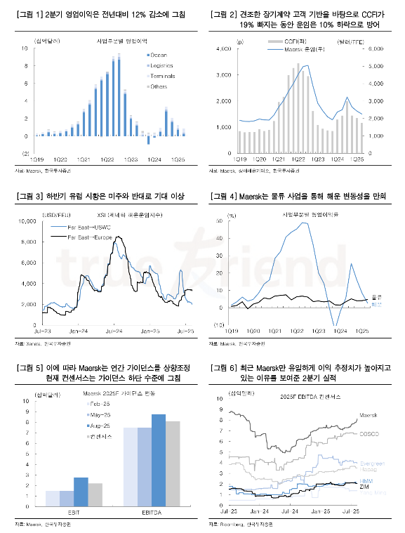 머스크가 오랜만에 무게감을 보여줬다는 평가다. 11일 한국투자증권 최고운 애널리스트에 따르면 머스크의 올해 2분기 실적은 시장 기대를 상회했다. 매출액은 전년동기대비 3% 증가한 131억달러, 영업이익은 12% 감소한 8.5억달러를 기록했다. 작년 2분기부터 홍해 사태로 인한 병목 수혜가 본격적으로 반영되기 시작했던 만큼 기저부담이 컸지만 물류와 항만사업의 호조 덕분에 선박했다. 부문별 영업이익은 해운 2억달러(-51% YoY, OPM 3%), 물류 2억달러(+39%), 터미널 5억달러(+31%)를 달성했다. 물류와 터미널 이익 기여도는 74%에 달했다. 2분기 평균 CCFI가 전년동기대비 19% 하락한 것에 비해 머스크의 컨테이너 운임은 장기계약 위주로 방어하며 10% 조정받는데 그쳤다.