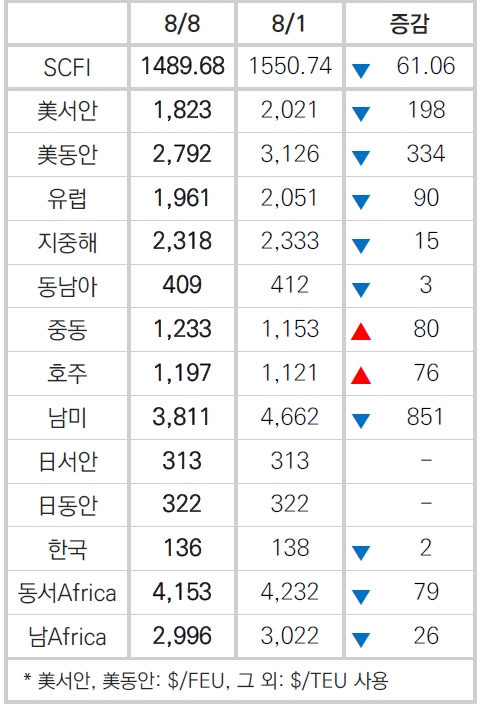 미주항로의 경우 미동서안이 4주 연속 하락했다. 중국발 수요 둔화, 2개월만에 2천달러선 붕괴됐다.