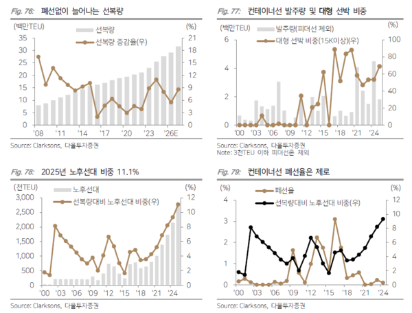 수주잔고는 낮다. 선복량 대비 수주잔고는 1.7%수준으로 2024년 2.7% 대비 1.0%p 감소했다. 벌크선사들의 BEP(손익분기점)은 BDI 기준 1,800~2,000p 수준으로 추정되는데 2026년 BDI가 1,139p 수준으로 추정되며 여타 선종대비 빠른 폐선이 시작될 수 있다고 판단된다고 오 애널리스트는 밝혔다.
