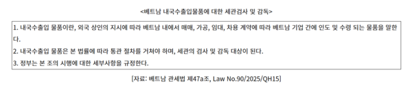관세법 시행령 Decree No.167/2025/ND-CP 제35조2·3·4항에 따라 내국수출입 물품은 반드시 통관 절차를 거쳐야 하며, 이 절차는 물품의 인도·수령 전 또는 후에 수행 가능하다. 통관 완료 전, 또는 통관 완료 이후 최종 인도·수령 시점까지 해당 물품은 세관의 검사 및 감독 대상이 된다. 내국 수출 신고 및 내국 수입 신고의 통관 절차를 모두 완료해야 최종적으로 통관이 이행된 것으로 간주한다.아울러, 물품의 인도 및 수령 시점, 장소, 방식은 외국 상인의 지시에 따라야 하며, 이러한 정보는 통관 절차 진행 시점 또는 물품 인도·수령 이전에 세관에 사전 통보해야 한다. 이와 관련해, 세부적인 통관 절차와 내국수출입 신고 방식을 구체적으로 규정하기 위한 시행규칙 개정 작업은 현재 진행 중이다.