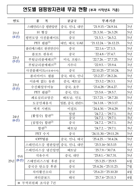* 덤핑방지관세 부과: (’21) 4건 (‘22) 5건 (’23) 5건 (‘24) 6건 (’25.8월) 8건(조사중 7건)