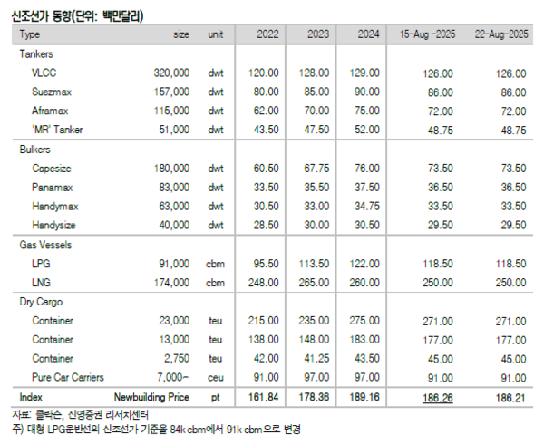 34주차(8월 22일) 신조선가지수는 전대비 0.05포인트 하락한 186.21p를 기록했다.