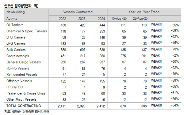 선종별 상세선가는 변동이 없었다. 34주차 수주량은 오일탱커 2척, LNG선 6척, 드라이벌크선 2척, 컨테이너선 16척 등 총 26척을 기록했다. 누적수주량은 896척이고, 전년동기 누적 수주량은 총 1,387척이었다.
