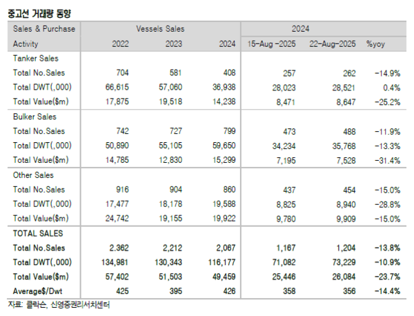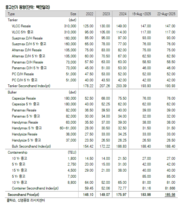 혹서기 비수기 움직임이 노정되고 있다. 지난 주 신조선가지수와 중고선가지수 모두 하락했다. 25일 신영증권 엄경아 애널리스트에 따르면