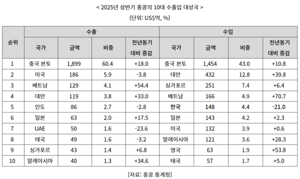 홍콩의 최대 교역 대상국은 중국 본토로, `25년 상반기 기준 전체 수출액의 60.3%, 수입액의 43%으로 가장 큰 비중을 차지했다. 전체 수출 상위 10개 대상국이 전체 수출의 84.6%, 상위 10개 수입 대상국은 전체 수입의 87.7%를 차지하는 등 홍콩의 무역구조는 소수 국가에 집중되는 구조를 보인다.