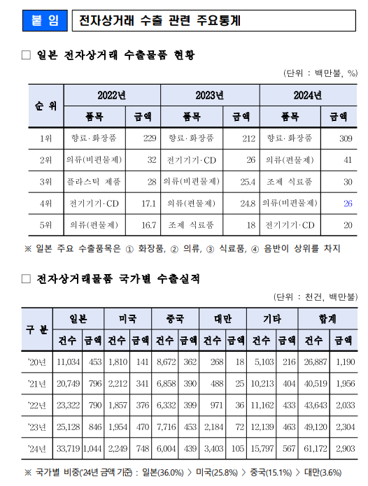 일본은 우리나라 전자상거래 수출의 최대 시장으로, 작년 기준 전체 전자상거래 수출액의 약 3분의 1(36%)을 차지하고 있다. 대일 전자상거래 수출액은 2021년 7억 9,600만 불에서 2024년 10억 4,400만 불로 약 31% 증가하였으며, 주요 수출 품목은 화장품·의류·식품·음반 등이다.