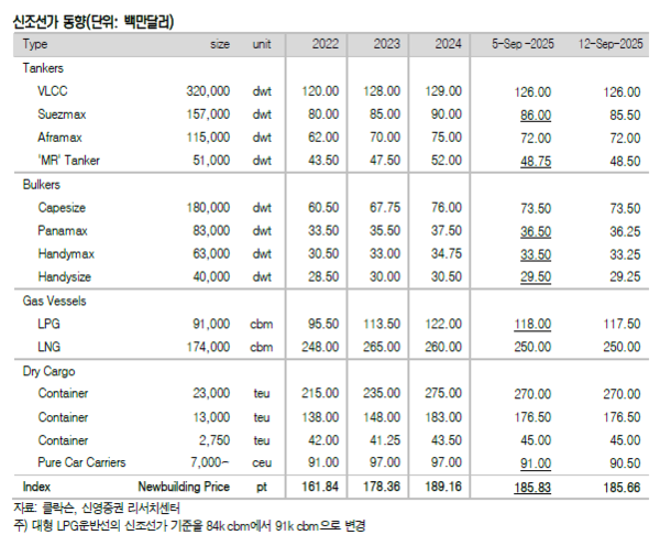 선종별 상세선가도 골고루 하락했다. 탱커 중 수에즈막스급이 50만달러 하락, MR탱커가 25만 달러 내렸다. 드라이벌크선 중 파나막스급, 핸디막스급, 핸디사이즈급이 모두 25만달러씩 하락한 것으로 나타났다. 가스선 중 91k(9만1000)cbm급 LPG선이 50만달러 하락했고 6,500CEU급 자동차운반선은 50만 달러 내렸다.