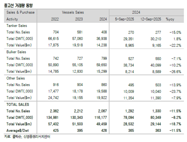 37주차(9/12) 중고선가지수는 전주대비 0.12포인트 상승한 185.87p를 기록했다. 선종별 상세선가는 변동이 없었다. 37주차 중고선박은 총 38척이 거래됐다. 누적기준 거래량은 1,330척이며, 전년동기 누적 거래량은 1,502척이었다.
