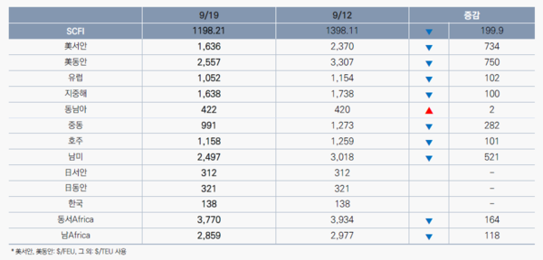 컨테이너 정기선 시황을 보면 SCFI가 3주 연속 하락했다. 극동/아주 외 전항로가 약세를 보였다.