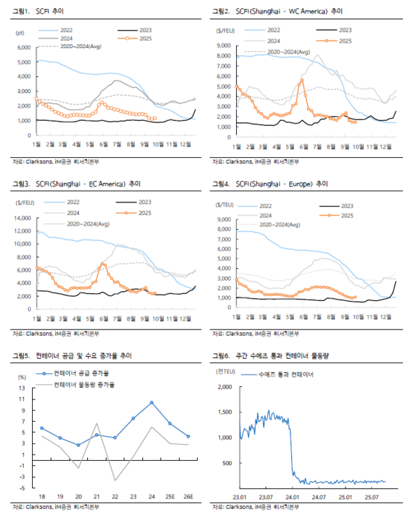 현재 컨테이너 운임은 2023년 수준으로 2020~2022년 코로나 팬데믹 특수 효과(항만 적체, 물동량 급등) 이후의 운임으로 회귀한 상황이다. 컨테이너 공급 증가 이슈(2025년 +6.6% YoY, 2026년 +4.6% YoY)와 수에즈 운하 통행 재개 이슈는 컨테이너 운임에 중장기적으로 여전히 부정적 요소로 작용할 것으로 예상된다.