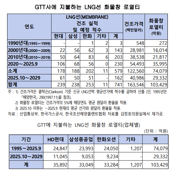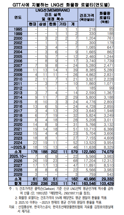 여기에 클락슨(Clarkson) 리서치 기준 각 년도 LNG선 평균선가와 한국은행의 평균 원달러 환율을 감안하고 건조가격의 5%를 적용해 계산한 결과 30년 동안 한국 조선소가 GTT에 지불한 로열티는 총 7조4097억 원에 달하는 것으로 추산되었다. LNG선 한 척을 건조할 때마다 평균 130억 원 꼴로, 한국 조선소가 어렵게 100척을 수주해 건조하면 프랑스 업체가 앉아서 1조3천억 원을 벌어간 셈이다.