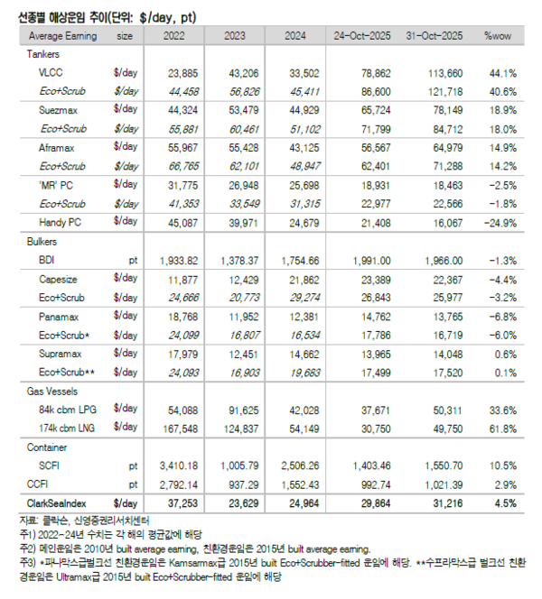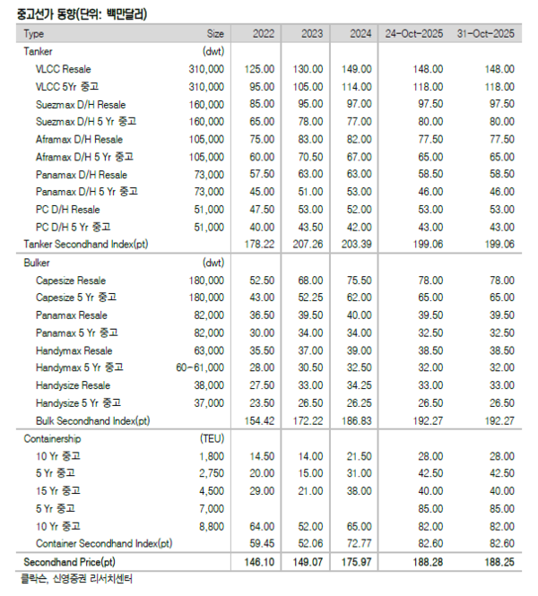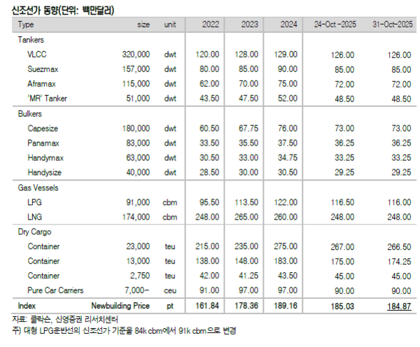 원유수송선 운임이 초강세를 보였다. 지난 주 신조선가지수와 중고선가지수 모두 하락했다. 신영증권 엄경아 애널리스트에 따르면 44주차(10월 31일) 신조선가지수는 전주 대비 0.16포인트 하락한 184.87p를 기록했다.