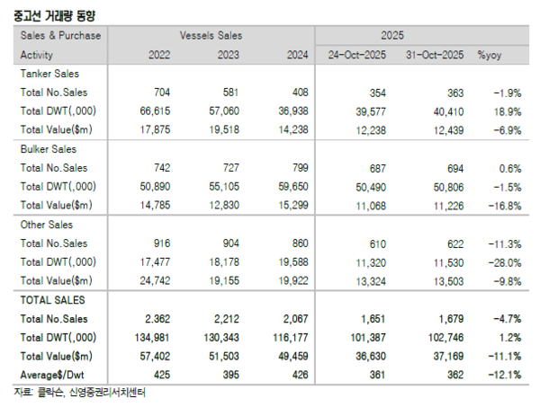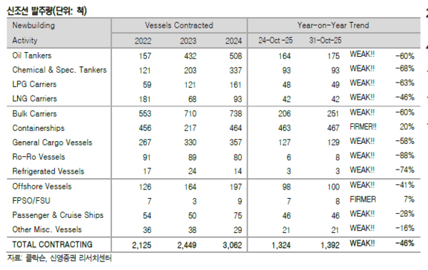 44주차 탱커는 11척, LPG선 1척, 드라이벌크선 45척, 컨테이너선 4척, 제너럴카고선 2척, 로로선 2척, 해양지원선 2척, 부유식해양구조물 1척 등 총 68척을 기록했다. 44주차 누적수주량은 1,392척이고, 전년동기 누적 수주량은 총 1,921척이었다.