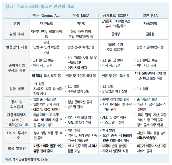 이에 보고서는 스테이블코인 시대를 대비해 무역·금융·규제 전반을 재편하는 선제적 대응이 필요하다고 밝혔다. 현행 외국환거래법과 대외무역법에는 스테이블코인 결제에 대한 명시적 규정이 없어 계약상 효력이나 외환신고 의무 등과 관련한 법적 불확실성이 존재하기 때문이다.