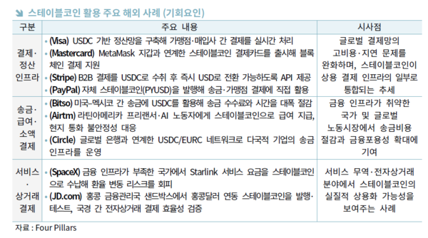 실제로 무역결제에 스테이블코인을 활용하면 국제송금 수수료를 기존 평균 6%에서 1% 내외로 낮추는 한편, 결제 시간도 기존 수일에서 수분 단위로 단축해 대금 회수 지연을 최소화하는 등 중소기업의 자금 운용 부담 완화 효과도 기대할 수 있다. 또한, 중개은행 없이 P2P 방식의 직접 결제가 가능해 금융 인프라가 취약한 신흥국과의 거래 접근성도 높일 수 있다.