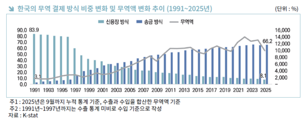 보고서는 스테이블코인을 활용한 무역결제의 확산이 단기적인 기술 변화가 아니라 과거 신용장(L/C)에서 송금(T/T)으로 결제 패러다임이 전환된 것과 유사한 구조적 변화의 시작점이라 진단했다. 단순한 효율성 개선을 넘어 무역금융의 디지털·자동화를 가속화하는 한편, 은행의 역할을 지급보증자에서 리스크 관리·규제준수 서비스 제공자로 변화시키는 등 국제결제의 구조적 변화가 예상되는 것이다. 또한, 금융 인프라가 부족한 신흥국을 중심으로 단계적 확산 후 제도적 신뢰가 확보되면 글로벌 결제 표준으로 빠르게 자리 잡을 가능성이 크다고 내다봤다.