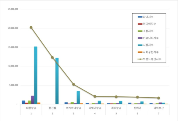 1위, 대한항공 브랜드는 참여지수 982,593 미디어지수 413,118 소통지수 982,224 커뮤니티지수 2,225,339 시장지수 15,142,289 사회공헌지수 468,714가 되면서 브랜드평판지수 20,214,277로 분석됐다. 지난 10월 브랜드평판지수 22,108,427과 비교해 보면 8.57% 하락했다.