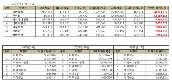 한국기업평판연구소는 국내 브랜드의 평판지수를 매달 측정하여 브랜드 평판지수의 변화량을 발표하고 있다. 2025년 11월 항공사 상장기업 브랜드평판지수는 2025년 10월 7일부터 2025년 11월 7일까지의 7개 항공사 상장기업 브랜드에 대한 빅데이터 분석 결과이다.