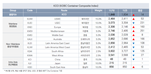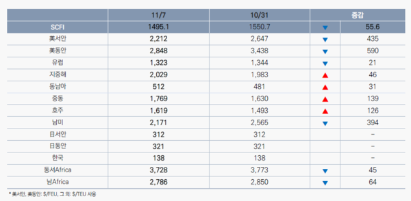 유럽항로의 경우 북유렵항로는 약세로 전환됐고 지중해항로는 선방했다. 10월 공급축소 확대로 반등에 성공한 북유럽 운임은 11월들어 약세 전환, 비수기 진입에 따른 수요둔화 영향으로 운임방어를 위해 주요 얼라이언스는 11월에도 20%이상의 선복축소를 추진할 것으로 전망된다.