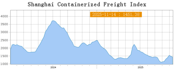 1500p 돌파하며 급상승세를 보였던 SCFI(상하이발컨운임지수)는 11월 7일(금) 한주 만에 하락세로 돌아섰고, 14일도 반등에 실패하며 2주 연속 내림세를 이어갔다. 상하이항운교역소에 따르면 14일 스팟 컨운임 지표 SCFI는 1451.38p를 기록해 전주 1495.1p보다 43.72p(3%)를 기록한 것으로 나타났다.