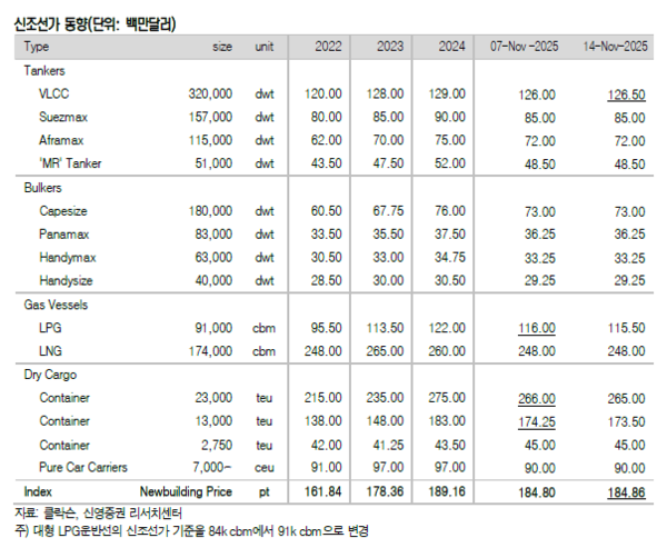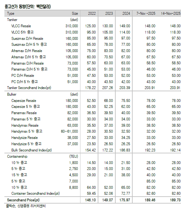 오일탱커 운임이 새로운 강세 수준이다. 지난 주 신조선가지수와 중고선가지수 모두 상승했다. 신영증권 엄경아 애널리스트에 따르면 46주차(11월 14일) 신조선가지수는 전주 대비 0.06포인트 상승한 184.86p를 기록했다.